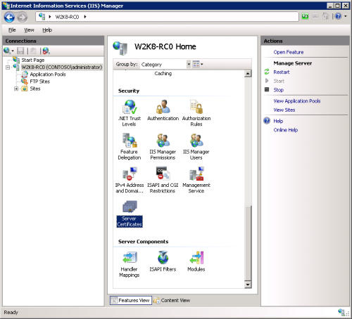 - In the Features pane (the middle pane), double-click the Server Certificates option located under the Security heading.