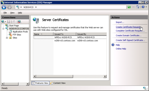 4. To begin the process of requesting a new certificate, from the Actions pane, choose the Create Certificate Request option.