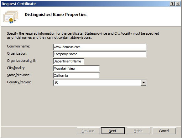 5. The first screen of the wizard asks for details regarding the new site. The common name should match the fully-qualified domain name for the site. Otherwise, provide information about your site, making sure to spell out the name of your state and locality.