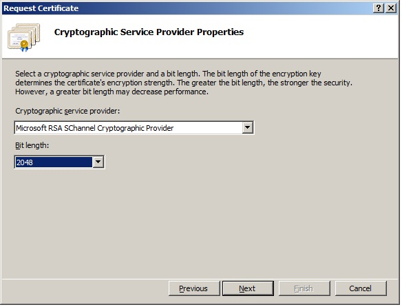 7. Select the cryptography options. The default, Microsoft RSA SChannel Cryptography Provider is preferred.